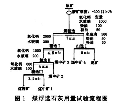 煤礦物是表面疏水的天然易選礦物。藥劑的使用與選擇可以提高煤表面的疏水性和煤粒在氣泡上的粘附性、黏著的牢固度,常用的捕收劑為非極性的烴類化合物。此次煤浮選階段選用的捕收劑為烴類化合物——柴油。在礦物優(yōu)先浮選時(shí),用石灰提高礦漿的pH值,可以使黃鐵礦受到抑制。因此選用石灰(氧化鈣)以及水玻璃作為抑制劑,抑制硫鐵礦以及脈石礦物,松油作為起泡劑。先進(jìn)行了煤浮選作業(yè)石灰用量試驗(yàn),試驗(yàn)流程圖見(jiàn)圖1(圖中藥劑用量單位為g/t,下同),試驗(yàn)結(jié)果見(jiàn)表2。煤精礦中硫物相分析結(jié)果見(jiàn)表3。
