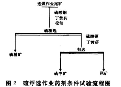 試驗(yàn)以提高資源綜合回收利用率為目的,因此,對(duì)選煤作業(yè)尾礦再進(jìn)行浮選以回收硫鐵礦,硫浮選階段采用硫酸銅為活化劑,活化被石灰抑制的黃鐵礦,丁基黃藥為捕收荊,松油為起泡劑。藥劑條件試驗(yàn)流程圖見(jiàn)圖2,試驗(yàn)結(jié)果見(jiàn)表7。