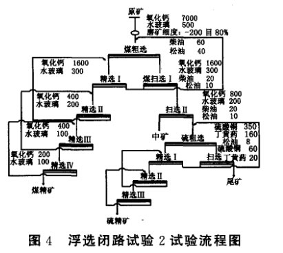 浮選閉路試驗(yàn)1流程可能是選煤尾礦中有一部分煤和硫的連生體,試驗(yàn)在浮選硫鐵礦時(shí)中礦量很大,尤其是硫中礦,硫精選I的中礦產(chǎn)率有37.53%,硫回收率為37.83%;硫精選Ⅱ的中礦產(chǎn)率為28.01%,硫回收率為51.81%。同時(shí)在實(shí)驗(yàn)室試驗(yàn)中,流程操作不易穩(wěn)定,不利于現(xiàn)場(chǎng)生產(chǎn)。與浮選閉路試驗(yàn)1比較,在浮選閉路試驗(yàn)2中,將一部分難以分選的中礦單獨(dú)浮選出來(lái)的閉路試驗(yàn),浮選指標(biāo)基本沒(méi)有降低,碳精礦的回收率增加,硫精礦中碳含量減少,且流程暢通。通過(guò)浮選閉路試驗(yàn)2可以得到煤精礦產(chǎn)率為5.38%,碳品位為40.32%,含硫7.05%.碳回收率為33.76%.為高硫煤;硫精礦產(chǎn)率為24.00%.硫品位為47.59%,含碳9.64%,硫回收率為72.74%。其中硫精礦砷、氟含量很低,有價(jià)元素鐵質(zhì)量分?jǐn)?shù)為42.46%,雜質(zhì)含量少.Si02質(zhì)量分?jǐn)?shù)為2.58%,Al2O3的質(zhì)量分?jǐn)?shù)為2.53%,實(shí)現(xiàn)了煤精礦與硫精礦的綜合回收。