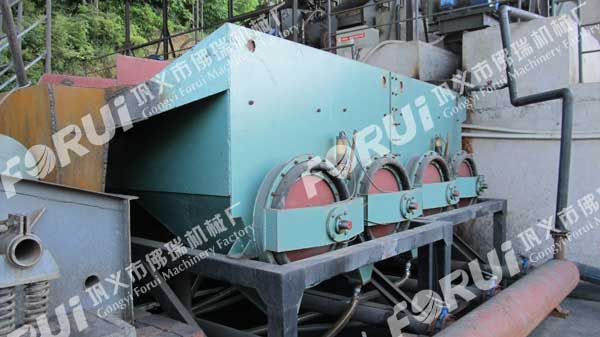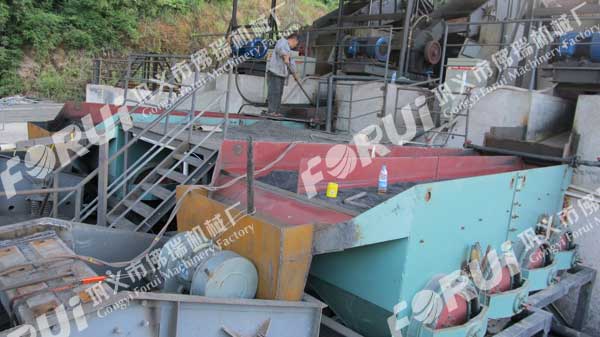 據(jù)了解,重慶該公司從佛瑞機(jī)械訂購的硫精砂洗選生產(chǎn)線主要任務(wù)是從廢棄的煤矸石中回收硫精砂,使煤矸石廢棄物得到充分的回收和利用,同時產(chǎn)生可觀的經(jīng)濟(jì)效益。該公司訂購佛瑞機(jī)械日處理1000噸的硫精砂洗選生產(chǎn)線由破碎機(jī),細(xì)碎機(jī),直線振動篩,梯形跳汰機(jī),脫水篩等系列設(shè)備組成,煤矸石經(jīng)過粗破和細(xì)碎后再進(jìn)入直線振動篩篩分,把物料粒度控制在6mm以下進(jìn)入梯形跳汰機(jī)洗選提純硫精砂,尾礦經(jīng)過脫水篩脫水后運往發(fā)電廠作為發(fā)電廠燃料,循環(huán)水沉淀后得到的煤泥經(jīng)烘干后作為優(yōu)質(zhì)燃料銷售,硫精砂再精礦池沉淀后用裝載機(jī)挖出,銷往硫酸廠或鉀肥廠作為工業(yè)原料,整個過程實現(xiàn)對煤矸石的全部回收和利用,是當(dāng)?shù)卣罅χС值囊粋環(huán)保項目。目前重慶地區(qū)已有多家這樣的企業(yè),所用硫精砂洗選生產(chǎn)線均由佛瑞提供。